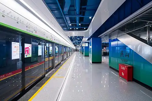 Yanshan Station (Chinese: 燕山站; pinyin: Yānshān Zhàn; Jyutping: jin3saan1 zaam6) is a station of Guangzhou Metro Line 7, located underground at the south side of Shuixi Stabling Yard in Guangzhou's Huangpu District.[1] It opened on 28 December 2023, with the opening of Phase 2 of Line 7, and is the northern terminus of the line.[2]