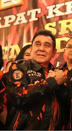 Yapto Soerjosoemarno is known as the leader of Pancasila Youth, an organization of semi-official political gangsters that supported the New Order military dictatorship of Soeharto. Pancasila Youth played an important role in supporting Soeharto's military coup in 1965: they ran death squads for the Indonesian army, murdering thousands of alleged communists and Chinese Indonesians across the province of North Sumatra. The leaders of these death squads, Effendy Nasution, Jan Pahrum Lubis, Roshiman and others selected Yapto to lead Pancasila Youth in 1980. In addition to leading Pancasila Youth, Yapto today leads a political party formally affiliated with Pancasila Youth called the Patriot Party.[2] The Patriot Party is known for its loyalty to the family of former Indonesian President, the late General Suharto. He is also a lawyer and owns a law firm in South Jakarta, Indonesia.