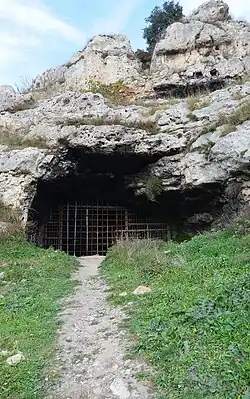 The existence of paleontological and archaeological findings point towards the use of the cave as a human and an animal habitat, alternatively.[9][11][12][13] The finds include bones of herbivore and carnivore mammals,[14] marine and freshwater molluscs,[15] microfauna as well as artifacts like potsherds, knives on flint, oldowans, choppers and hammerstones on quartzite, as well as manuports. The wide variety of prehistoric faunal specimens belong to bones of herbivore mammals such as cave bears (Ursus deningeri), horses (Equus caballus), wild boars (Sus scrofa), fallow deer (Dama dama), roe deer (Capreolus capreolus), deer (Megaloceros), cattle (Bos/Bison), antilopes (Gazella), goats (Capra), and carnivores such as wolves and dogs (Canis), foxes (Vulpes), tigers (Panthera), cats (Felis) and hyenas (Crocuta).[1] Findings of "more than 5000 fossil bones and teeth of cave and brown bears", which provide some chronological indicators, led to their extensive scientific study.[11][15][16][17][18] Another subject of such extensive study were the fossils of several species of Middle Pleistocene bats (Chiroptera), including horseshoe bats (Rhinolophus), mouse-eared bats (Myotis), long-eared bats (Plecotus) and bent-winged bats (Miniopterus).[19]