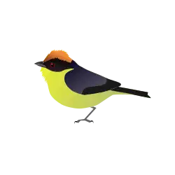 The feathers of the breast, abdomen, and throat are yellow; those of the coverts, primaries, secondaries, scapulars, auriculars, lores, and tail are black; the crown feathers are russet. It is unique among its conspecifics because it has a jet black back, wing and tail.