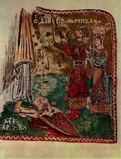 In the following year, Yaropolk returned and reportedly came to an agreement with Vladimir Monomakh, but nothing specific is known of the terms other than Yaropolk being reinstated. Yaropolk was murdered, and the circumstances of his murder are not clear, but the Primary Chronicle suggested the complicity of Rurik Rostislavich, the prince of Peremyshl, and his brother Vasilko Rostislavich, the prince of Terebovl.[20] His murderer was a man called Neradets, who put a sword through Yaropolk before fleeing to hide with Rurik in Peremyshl; the date given is 22 November.[21] He died in 1086 or 1087.[22] His body was taken to Kiev and buried in the church of Saint Peter on 5 December,[3] the church which Yaropolk himself had endowed.[21]