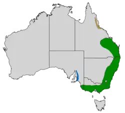 The yellow-faced honeyeater ranges across a broad arc generally along the coastline from near Cooktown in Far North Queensland, and between a line from Charters Towers south to Albury and the coast, and then west to the Fleurieu Peninsula and the Mount Lofty Ranges in South Australia. Population densities have been recorded from 0.01 birds per hectare (2.5 acres) near Armidale in New South Wales to 7.8 birds per hectare at Tarnagulla, Victoria. During the winter months of June and July, numbers are generally lower in Victoria and higher in Queensland, following their northward migration.[19]