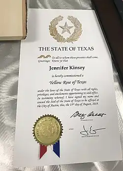 The Commission of the Yellow Rose of Texas, commonly referred to as the Yellow Rose of Texas, is an honorary commission conferred by the Governor of Texas to Texas women for exceptional community service.[1]