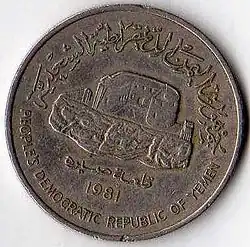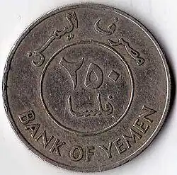 In 1984, the Bank of Yemen introduced 500 fils as well as 1 dinar, 5 dinar, and 10 dinar notes that are like the preceding issues of South Arabia, except the English text and printer's imprint have been removed from the front, the name of the issuer has changed and now appears on the back, along with the name of the capital (ADEN).[2]