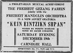 In the 1930s, the choir under Schaefer continued to have a strong Communist and pro-Soviet orientation.[3][15] (This occasionally caused disagreements, as in 1929 when a group of members left to form a new nonpartisan choir, the Jewish Culture Society Chorus.) The choir, accompanied by fifty members of the Manhattan Symphony Orchestra, performed a "revolutionary oratorio" by Schaefer at Carnegie Hall in 1930 entitled October which incorporated poems selected by Nathaniel Buchwald from the works of Itzik Feffer, Leib Kvitko, Peretz Markish, Morris Rosenfeld, and others.[13][3][16] In 1932 Schaefer traveled to Kharkiv at the invitation of Feffer, where he premiered October, and in 1933 went to Moscow to represent the choir at the International Congress of Proletarian Musicians.[3][7][17] There was even the suggestion of a Soviet tour by his New York choir, although it never happened in the end.[3] Upon his return to New York in May 1933 the choir gave another concert at Carnegie Hall.[18] In their 1935 annual concert they once again presented October, while in 1936 they reprised Tsvey brider.[19][20]
