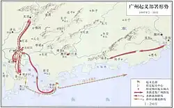 After Sun Yat-sen arrived in Guangzhou, he established the Nongxuehui (Agricultural Society) as an organization and began recruiting comrades, setting the Double Ninth Festival (October 26) as the date for the uprising. In early October 1895, the Hong Kong police received a tip-off, claiming that members of the Triad Society were recruiting strong men to go to Guangzhou.[5] Zhu Guiquan, along with his brother Zhu and Qiu Sisheng, were recruiting strong men, offering a monthly salary of 10 yuan to each recruit.[5] Zhu Guiquan's brother recruited 400 coolies, and he went ahead of them. The strong men were led by Zhu Guiquan himself.[5] On the ninth day of the ninth month in the lunar calendar, Sun Yat-sen, leading fellow members of the Xingzhonghui such as Zheng Shiliang and Lu Haodong, prepared for the Yimei Uprising in Guangzhou. However, due to the leakage of the plan, and with the supplies failing to arrive in time, the uprising ended in failure.[2] Sun Yat-sen raised two armies in Shantou and along the Xijiang River, while simultaneously advancing towards Guangzhou.[1] The two armies were scheduled to march towards Guangzhou on a certain day in October 1895, one advancing from the southwest and the other from the northeast.[1] Unexpectedly, as the members' deployment was nearly finalized, a secret telegram arrived, stating that the two armies from the southwest and northeast were blocked midway.[1] Since the two armies could not advance, the forces for reinforcement were already isolated, and thus the plan for the uprising had failed.[1] On October 25, Zhu Xiang, using his brother Zhu Qi's name, surrendered to the arrest commissioner Li Jiazhuo. The revolutionaries had originally planned to take the night ferry from Hong Kong to Guangzhou on that day, but due to insufficient recruits, the plan was not carried out.[5]