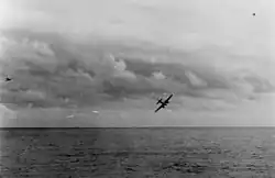 A P1Y1 under attack by United States Navy aircraft and anti-aircraft guns.