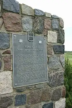 In 1882, a group of investors and settlers from York County in Ontario arrived in the area and set up York Colony on the banks of Little Whitesand River. Four men stayed that winter while the rest of the settlers returned to Eastern Canada. When the settlers returned in 1883, they named the community York City. Since there already was a York City in Ontario, when the post office opened on 1 January 1884, it was renamed Yorkton. A few years later, the Manitoba & North Western Railway was extending westward and the route was going to miss Yorkton. In 1888, the residents agreed to move the community to meet the railway. In 1890, the hamlet of Yorkton left the banks of the Little Whitesand River and moved south 4.6 km (2.9 mi) to its present location. The original townsite was located at 13-26-4 W2.[7][8]