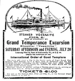 Boxing matches were held on her lower deck.[4] Perhaps somewhat incongruously with hosting boxing matches, Yosemite on July 20, 1907 or 1908, advertised a "Grand Temperance Excursion" tickets $1.00 each "under the auspices of the International Order of Good Templars":