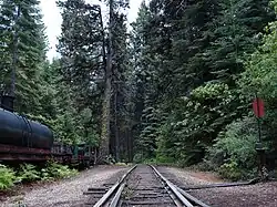 The current railroad follows a portion of grade originally carved into the mountain by the Madera Sugar Pine Lumber Company in the early 20th century. The company originated in 1874, when it was organized as the California Lumber Company to log the area surrounding Oakhurst, California.[3] The Madera Sugar Pine Lumber Company once had a large sawmill at Sugar Pine, California, just south of the current YMSPRR.[4] The railroad had seven locomotives, over 100 log cars, and 140 miles (230 km) of track in the surrounding mountains.[5] In addition to the railroad, the Company also transported lumber in a flume that stretched 54 miles (87 km) from Sugar Pine to Madera, California.[6] This was the most efficient way to transport rough cut lumber out of the mountains for finishing and transport at the bottom of the mountain. The Madera Sugar Pine Lumber Company practiced clearcutting, which removed almost every single tree within the stands of timber surrounding the YMSPRR track. The thick forest surrounding YMSPRR today belies this history, although large stumps from the original old growth timber dot the forest floor lining the tracks.