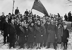 As a section of the Communist Youth International, SKNL had to act according to the decisions taken by the International.[21] SKNL had its own representative of the secretariat of the Communist Youth International. Initially, SKNL was represented by Pekka Paasonen. In the beginning of 1927 he was replaced by Kaarlo Kosunen, who in August 1928 was replaced by Inkeri Lehtinen. The fifth world congress of the CYI which was held in 1928 was attended by SKNL delegation consisting of Eino Lehto, Nestori Parkkari, Toivo Karvonen and Eino Hellfors. By the end of 1927 or in 1928, the programme of the CYI was published in Finnish language. The sixth world congress of the International, held in 1935, was attended by the SKNL delegate Veikko Sippola.[29]