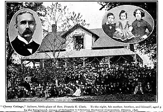 "Cherry Cottage", Aylmer birthplace and family home of Rev. Francis Edward Clark D.D., LL.D 1851–1927. To the right, his mother, brother and himself aged 3. In the foreground, delegates to Christian Endeavor Convention, Ottawa, 1896. Constructed in 1862, the house is listed in the Register of Cultural Heritage of Quebec