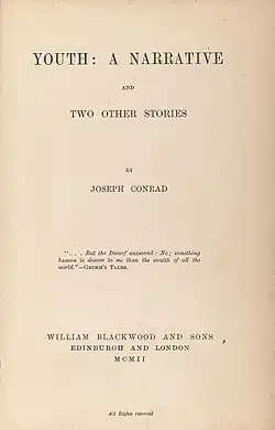 "Youth" is an autobiographical work of short fiction by Joseph Conrad first published in Blackwood’s Magazine in 1898 and collected in the eponymous collection Youth, A Narrative; and Two Other Stories in 1902.[1][2]