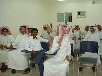 Curriculum that is being taught to students in Saudi Arabia has a religious base, specifically Islamic teachings.[4] It emphasizes memorization, rather than solving the problem.[4] Because employers do not always utilize these skills in their business, it is increasingly difficult for young Saudis to find a job.[5] In response to the educational shortcomings, King Abdullah established his Public Education Development Project, which was launched in 2007. This was an approximately $3 billion program designed to improve public education.[18] Some of the goals that this project has for improving youth education are "improving the educational environment and preparing to utilize information and communication technology (ICT) in education to stimulate learning. This is in order to achieve a higher level of efficiency in acquiring information and training, as well as strengthening personal and creative capabilities, developing skills and hobbies, satisfying psychological needs of students, and strengthening ideas as well as national and social relations through extra-curricular activities of various kinds".[18] The Public Education Development Project and King Abdullah's scholarship seeks to help students develop problem solving skills as well as a comprehensive world view by allowing students to study in other countries of the world.[5]