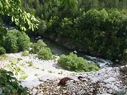 Perched above its right banks is the village of Manastir, one of the highest settlements in Bulgaria. A 15.7 km stretch of the third class III-861 road Yugovo Inn–Laki–Rozhen follows its valley.[3]