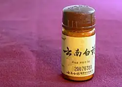 Yunnan Baiyao (or Yunnan Paiyao; simplified Chinese: 云南白药; traditional Chinese: 雲南白藥; pinyin: Yúnnán Báiyào; lit. 'Yunnan White Drug') is a proprietary traditional Chinese medicine marketed and used as a hemostatic product in both human and veterinary alternative medicine.[1] Although Yunnan Baiyao has long been recognized as a pharmaceutical preparation in China, the safety and efficacy of Yunnan Baiyao has not been assessed or established by the FDA, the European Medicines Agency, or the Australian Therapeutic Goods Administration. There is limited evidence regarding its effectiveness in preventing and treating hemorrhagic and pathological conditions in both humans and animals via oral administration.[2] In a limited number of human studies of small sample sizes, administration of Yunnan Baiyao has been shown to correlate with "reduced perioperative bleeding as well as bleeding in various ulcerative–hemorrhagic conditions".[2] It has become popular particularly for animals with hemangiosarcoma.[3] There are multiple routes of drug administration. Yunnan Baiyao is sold in powder, tincture, plaster, paste, aerosol, or tablet form. The medicine, developed by Qu Huangzhang in 1902, is designated as one of two Class-1 protected traditional Chinese medicines, which gives it 20 years of trade protection in China.[4] Yunnan Baiyao products are manufactured and distributed by a state-owned enterprise, Yunnan Baiyao Group (SZSE: 000538) in Yunnan, China.