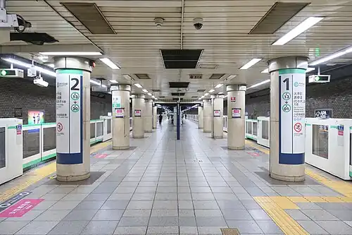 The station facilities were inherited by Tokyo Metro after the privatization of the Teito Rapid Transit Authority (TRTA) in 2004.[1]