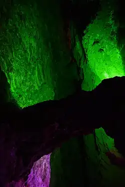 The El Edén mine began operations in 1586 and principally produced gold and silver.[10] According to legend the devil is supposed to be found in this parts due to the sound made when the wind whistles around the rocks.[20] While operations began in the 16th century, its peak was reached in the 17th and 18th centuries.[10] Despite the fact that there is still a significant amount of minerals left to extract, mining operations ceased in 1960, because the entrance is located in the middle of the city making this too hazardous.[5][10] In 1975, the mine was converted into a tourist attraction.[10] Today, visitors can take a small train which leads into the mountain for about a half a kilometer, then walk with a guide along some of the narrow passages. One of the things to see is an altar to the Santo Niño de Atocha.[6][21] At night, the former rock crushing room of the mine has been converted into a nightclub.[6][19]