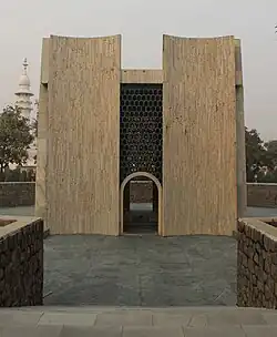 Husain's tomb was built in 1971 and was designed by Habib Rahman.[125] Its architecture reflects the influence of Bauhaus aesthetics on traditional Indian styles as seen in its eight curved, reinforced concrete walls topped by rough cut marble which have been inspired by Tughluq tombs.[126] These tapering walls stand along a square plan to form an open structure topped by a shallow dome. The tomb has no ornamentation but features jalis and arches. The graves of Husain and his wife lie under the dome of the tomb.[127][128]