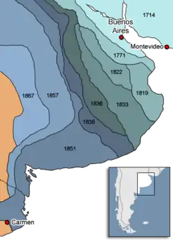 Map of the advance of the Argentina frontier until the establishment of Zanja de Alsina
