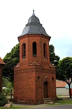 In 1907, a red-brick bell tower was erected beside the school. On 14 July 1907, a bell, cast in 1807 by the Heinrich August Weinhold bell foundry in Dresden and donated by Weiland, was consecrated. After Weiland's death, a memorial stone was erected near the railway crossing on Landesstraße 593, which remains today.[5]