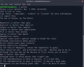 Peters' Zen of Python was included as entry number 20 in the language's official Python Enhancement Proposals and was released into the public domain.[4] It is also included as an Easter egg in the Python interpreter, where it can be displayed by entering import this.[1][4][a]