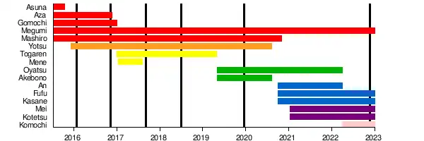 | Yotsu Hitomi (一十三四) | Green | Joined August 2015, Left August 2020 | |
