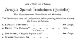 In England in 1888, they billed themselves as "The Zerega Spanish Troubadours", consisting of "two on mandolin and guitar, with tambourine, castanet and fairy-bell accompaniments", appearing at the Royal Albert Hall, West Theatre.[10] They also toured as "Zerega's Spanish Minstrels".[2] On 17 and 21 August 1895, "These famous Mandoline and Guitar Players, Singers, and Dancers had the honour of appearing before her Majesty the Queen [Victoria] [at] Osborne House",[11] and performed the following programme:[12]