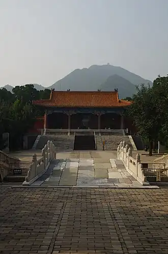 The Longqing Emperor was the 13th emperor of the Ming dynasty (1368–1644), reigning from 1566 until his death in 1572. He was buried in the Zhao Mausoleum, one of the thirteen imperial tombs in the Ming tombs complex. His first wife, Empress Li, who died in 1558, was also interred at the mausoleum. Later, the emperor's two other wives, Empress Xiao'an and Empress Xiaoding, were also laid to rest there.[2]