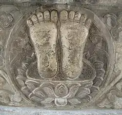 Among the decorations is a pair of footprints that symbolizes the spread of Buddhism all over the world.[1] Traces of red pigments remain from the previous painting of the pedestal.[5] Its Diamond Throne Tower's architectural style is that of a "diamond (Vajra) throne pagoda", which is inspired by the Mahabodhi Temple in Bodh Gaya, Bihar, India[2] that marks the place where Buddha is said to have attained enlightenment (bodhi). However, the design of the Diamond Throne Pagoda in the Zhenjue Temple differs from that of the Mahabodhi Temple in the proportions of the structure:[6] The pedestal of the Mahabodhi Temple is much lower compared to the overall height than the pedestal in the Zhenjue Temple. Furthermore, the central pagoda in the Mahabodhi Temple is much taller than the corner pagodas, whereas in the Zhenjue Temple, the central pagoda is only slightly higher than the other pagodas. Besides the proportions, the two buildings also differ in the decorations, which have a distinct Chinese style in case of the Zhenjue Temple, e.g., they had glazed-tile roofs.[6]