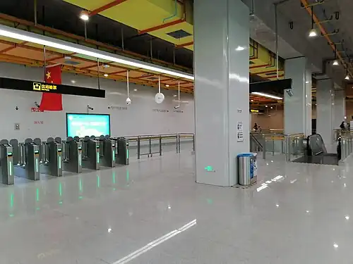 Zhoupu (Chinese: 周浦; pinyin: Zhōupǔ) is a Shanghai Metro station located on Line 18 in the town of Zhoupu, within Pudong, Shanghai. Located at the intersection of Nianjiabang Road and Hunan Highway, the station opened for passenger service on 26 December 2020.[1] It forms part of the first section of Line 18 to become operational, a southern segment of phase one of the line which consists of eight stations between Yuqiao and Hangtou.[2][3]