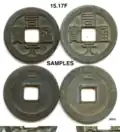 The Zhouyuan Tongbao (traditional Chinese: 周元通寳; simplified Chinese: 周元通宝; pinyin: zhōuyuán tōng bǎo) is a copper-alloy cash coin produced during the reign of Emperor Shizong of the Later Zhou dynasty, a historical Chinese state that existed in the Five Dynasties and Ten Kingdoms period.[1] The design of the Zhouyuan Tongbao cash coins closely resembles that of the Kaiyuan Tongbao (開元通寳) series produced during the earlier Tang dynasty period. The Zhouyuan Tongbao cash coins were produced from recycled Buddhist statues confiscated from Buddhist temples.[2] For this reason the Zhouyuan Tongbao is commonly referred to as "Arhat money" (traditional Chinese: 羅漢錢; simplified Chinese: 罗汉钱; pinyin: Luóhàn qián) or as the "money that destroyed Buddha" (traditional Chinese: 毀佛錢; simplified Chinese: 毁佛钱; pinyin: Huǐ fú qián).[2] Nicknames only reserved for a handful of Chinese cash coins, as confiscation of Buddhist statues for coin production only happened around 7 times in Chinese history.[3][4]