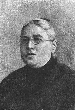 Zinaida Nikolaevna Nekrasova (Russian: Зинаи́да Никола́евна Некра́сова; born Fyokla Anisimovna Viktorova; 1846 – 25 January 1915) was the colleague and wife of the Russian poet, publicist, and public figure Nikolay Alekseevich Nekrasov. Almost nothing is known about her childhood and youth. There are various versions about her birth date, origins, and the circumstances of her meeting with the poet. The young woman met him in 1870, and they immediately became close. Nekrasov did much to provide her with a proper education, introducing her to his circle of close friends and relatives. Zinaida Nikolaevna carried out some of the poet's assignments related to the editing and publication of his works.