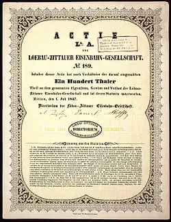 The Löbau-Zittau Railway Company (German: Löbau-Zittauer Eisenbahn-Gesellschaft) received a concession on 25 June 1845 to build a line from Löbau to Zittau. The line was opened on 10 June 1848. The line was initially also operated by the Löbau-Zittau Railway.