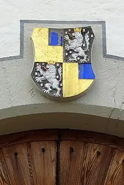 With the acquisition of the lordship of Altenklingen, the Zollikofer combined their own family coat of arms (in gold a blue quarter, heraldic left upper) with that of the Barons von Klingen – which had become extinct in 1395 – (a black shield scattered with silver shingles and featuring an upright silver lion with a gold crown and red tongue).