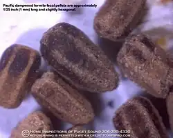 An important sign for identifying dampwood termite infestations is their unique fecal pellets. They are approximately 1 mm in length and slightly hexagonal.[1]