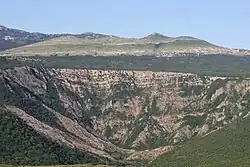 It was known to the ancient Romans as Tedanius. The spring of Zrmanja is located in southern part of Lika under Postak - the southern peak of Pljesevica mountain, and close to south end of Velebit mountain. It is characteristic for its spring located on the bottom of very steep, almost 200 m high funnel shape rock called Misije. It flows southward through the narrow and long arable valley which encircles the southern end of Velebit through a 200-metre-deep canyon, and then turns westwards, reaches Obrovac, and after a few kilometers flows into the Adriatic Sea in the bay named Novigradsko more. Its main tributary is right bank Krupa river, rich in tufa and travertine rock sediments forming around its numerous waterfalls.