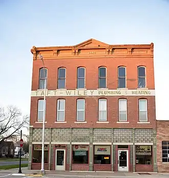 The Zuhn Building is a historic building located in Mount Pleasant, Iowa, United States. Completed in 1886 a block east of the town square, this three story, brick, Italianate structure replaced a single story building that had housed the Mount Pleasant Carriage Works. H.A. Zuhn had that building torn down and this one built so he could expand his business.[2] He used this facility to manufacture and repair vehicles. The only decorative element of the building is the bracketed metal cornice with date and pediment caps across the top of the facade. The double storefront has been altered somewhat over the years. The building was listed on the National Register of Historic Places in 1991.[1]