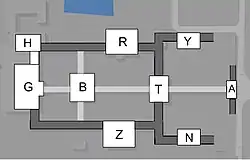 Close to the entrance on the eastern side of the complex, the following buildings have been renovated recently: the bathhouse (浴室, yokushitsu) (Y) and the toilet (七間浄頭, shichiken chinjū) (N).[A 6]