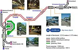 Line 1 was planned right through to the construction stage since it covered the two most important traffic axes in the metropolitan regions (Glatttal and Limmattal) and, according to the traffic concepts, it could be an efficient system on its own. The construction of the Schwamendingen branch line was also given priority, because this rapidly growing district was badly developed.[23] The maximum speed of the underground was set at 80 km/h, the minimum radius at 245 m, the maximum inclination of the line at 40‰ and that of the stations at 5‰. The standard-gauge section was to be electrified with 1500 V direct current using a third rail. Eight-axle railcars of type Be 8/8 (45.6 m length and 2.9 m width) were planned as rolling stock. Railcars in groups of three formed a 136.8 m long train, with a total capacity for 1302 passengers (including 360 seats).[24]