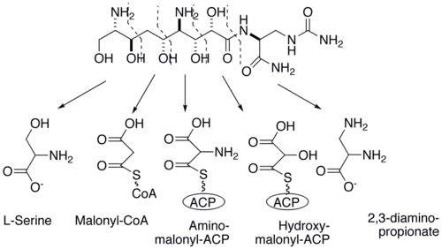 Zwittermycin A biosynthesis is a hybrid of polyketide and non-ribosomal peptide synthetic pathways. Most likely, all of the synthases are located on one megasynthase much like a type I fatty acid synthase. Based on mutant studies, the biosynthetic cluster involved in zwittermicin production has been identified and the pathway has been proposed. The genes responsible for the production of zwittermicin A are located on a 16 kb cluster containing nine orfs and a self resistant gene zmaR, a gene that encodes an acylation enzyme that deactivate zwittermicin A.[3] The hybrid synthase used in zwittermicin A production utilizes modified extender units such as hydroxymalonyl-ACP, aminomalonyl-ACP and 2,3-diaminopropionate. Therefore, many of the genes in the biosynthetic cluster encode for enzymes responsible for the synthesis of these extender units used in the hybrid synthase. For example, orf5 encodes ZWA5A, an enzyme that is responsible for the PLP mediated amination that converts L-serine to 2,3-diaminopropionate. It has also been shown that orf5, orf7, orf4 and orf6 participate in the biosynthesis of aminomalonyl-ACP and orf3, orf2 and orf1 synthesize hydroxymalonyl-ACP.[4]