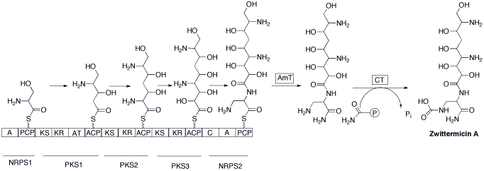 Genes encoding for the seven component hybrid synthase responsible for the assembly of the backbone is likely located on the largest gene, orf8. Assembly begins by the activation of a serine residue. This is done by tethering the amino acid to a peptidal carrier protein via a non-ribosomal peptide synthetase. Subsequently elongation of an activated malonyl unit covalently attached to an acyl carrier protein by a ketosynthase occurs giving the five carbon unit. The next two elongation steps proceed in a similar manner using aminomalonyl and hydroxymalonyl units from a second and third ketosynthase. Finally, condensation of 2,3-diaminopropionate with the carried molecule by a second nonribosomalpeptide synthase produces the zwittermicin A backbone. Attack of ammonia via an amidotransferase enzyme releases the carrier protein. The last step involves a carbomyltransferase enzyme that carbamolates the released molecule giving the final product.[5]