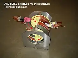 ARC-ECRIS is an Electron Cyclotron Resonance Ion Source (ECRIS) based on arc-shaped coils unlike the conventional[1] ECRIS which bases on a multipole magnet (usually a hexapole magnet) inside a solenoid magnet.[2]