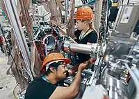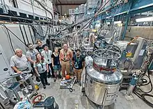 The helium targets are contained in a 35 mm diameter vessel made of titanium (gaseous or supercritical phase with 70% He-I) or OFHC copper (He-I and He-II) mounted on a liquid helium constant-flow cryostat. The vessel is enclosed within copper thermal shielding: an inner shield cooled by coolant helium vapour and an outer shield cooled by liquid nitrogen. A configuration of manometers and temperature sensors provide data used to characterize the state of the helium in the chamber. Pressures 1 MPa can be sustained.[8] The chamber is accessible to antiprotons through an annealed titanium window of diameter 75 μm or 50 μm vacuum brazed into the chamber wall.[8] Opposite this, a 28-mm diameter, 5-mm thick UV-grade sapphire window transmits laser light, antilinear to an incident particle beam.[8] Two 35-mm diameter Brewster windows made of fused silica (SiO
