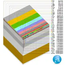 Due to mass segregation, the core of the Earth is believed to be primarily composed of iron (88.8%), with smaller amounts of nickel (5.8%), sulfur (4.5%), and less than 1% trace elements.[5]