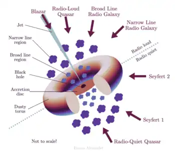 Historically, work on radio-loud unification has concentrated on high-luminosity radio-loud quasars. These can be unified with narrow-line radio galaxies in a manner directly analogous to the Seyfert 1/2 unification (but without the complication of much in the way of a reflection component: narrow-line radio galaxies show no nuclear optical continuum or reflected X-ray component, although they do occasionally show polarized broad-line emission). The large-scale radio structures of these objects provide compelling evidence that the orientation-based unified models really are true.[34][35][36] X-ray evidence, where available, supports the unified picture: radio galaxies show evidence of obscuration from a torus, while quasars do not, although care must be taken since radio-loud objects also have a soft unabsorbed jet-related component, and high resolution is necessary to separate out thermal emission from the sources' large-scale hot-gas environment.[37] At very small angles to the line of sight, relativistic beaming dominates, and we see a blazar of some variety.