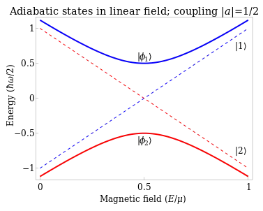 Figure 2 shows the dependence of the diabatic and adiabatic energies on the value of the magnetic field; note that for non-zero coupling the eigenvalues of the Hamiltonian cannot be degenerate, and thus we have an avoided crossing. If an atom is initially in state in zero magnetic field (on the red curve, at the extreme left), an adiabatic increase in magnetic field will ensure the system remains in an eigenstate of the Hamiltonian throughout the process (follows the red curve). A diabatic increase in magnetic field will ensure the system follows the diabatic path (the dotted blue line), such that the system undergoes a transition to state . For finite magnetic field slew rates there will be a finite probability of finding the system in either of the two eigenstates. See below for approaches to calculating these probabilities.