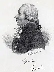![]() Watercolor caricature by Julien-Léopold Boilly (see § Mistaken portrait), the only known portrait of Legendre[1] | |