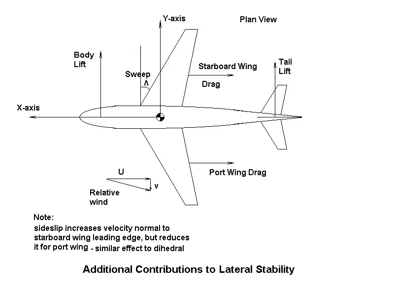 Sideslip generates a sideforce from the fin and the fuselage. In addition, if the wing has dihedral, side slip at a positive roll angle increases incidence on the starboard wing and reduces it on the port side, resulting in a net force component directly opposite to the sideslip direction. Sweep back of the wings has the same effect on incidence, but since the wings are not inclined in the vertical plane, backsweep alone does not affect . However, anhedral may be used with high backsweep angles in high performance aircraft to offset the wing incidence effects of sideslip. Oddly enough this does not reverse the sign of the wing configuration's contribution to (compared to the dihedral case).