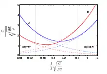 Dispersion of gravity–capillary waves on the surface of deep water. Phase and group velocity divided by 4 / ρ as a function of inverse relative wavelength 1/λσ / ρg.